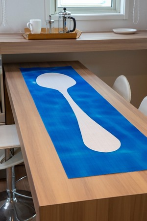 水面に浮かぶスプーンをシルエットで表現。太い糸と細い糸が織りなした絣文様生地、水紋のブルーとホワイトの2トーンで、空間に清涼なイメージをデザイン。